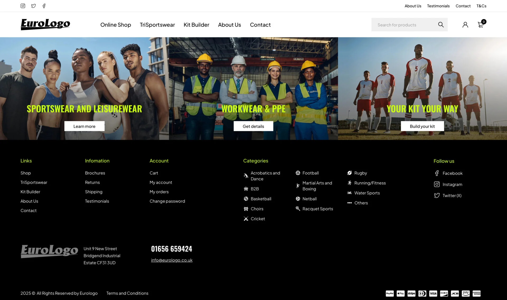 Eurologo, a sportswear and leisurewear retailer based in the UK, approached me to redesign their online store and bring it up to modern e-commerce standards. Their previous website had been pieced together over time, making updates difficult and limiting their ability to showcase new product lines. They wanted a clean, fast, and reliable store that would better represent their brand and support both everyday shoppers and sports teams looking for custom apparel.